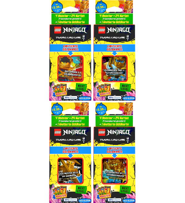 Alle 4 verschiedenen "Lego Ninjago Serie 8 NEXT LEVEL Eco-Blister" mit insgesamt 16 Tüten (=96 Karten) und diesen 4 LE-Karten: