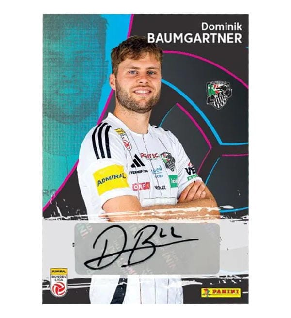 Collectors Tin Set mit 18 Tüten + 3 Trading Cards aus der Panini Bundesliga Österreich 2025-26 Sticker-Kollektion. Jede Tüte enthält 6 Sammelbilder.