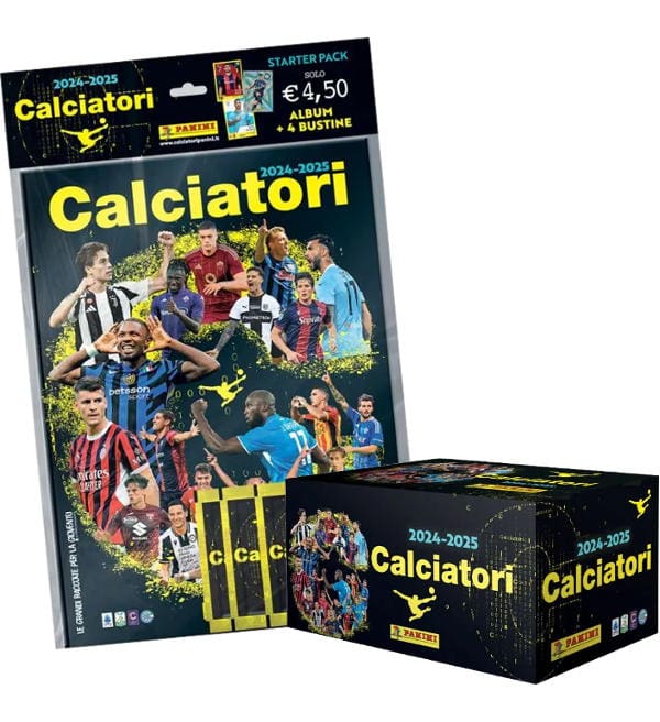 Starter Pack + Display mit 100 Tüten aus der "Panini Calciatori 2024-2025 Serie A" Sticker-Kollektion. Jede Tüte enthält 6 Sammelbilder + 1 "Fuori Raccolta" Sticker.
