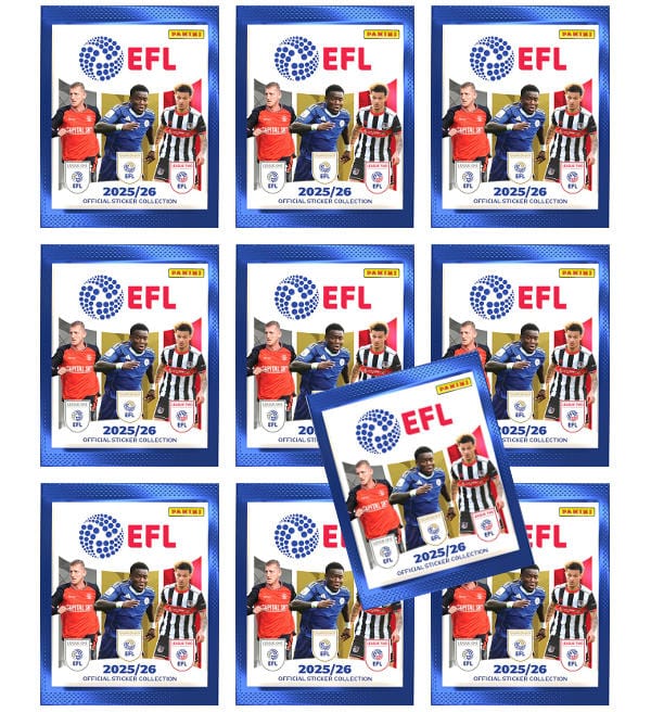 10 Tüten aus der Panini EFL 2025-26 Sticker-Kollektion. Jede Tüte enthält 5 Sammelbilder.