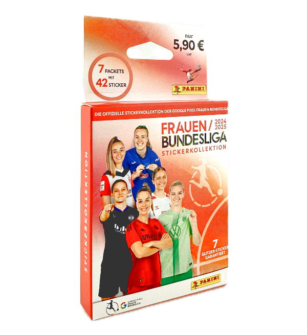 1 Eco-Blister (=7 Tüten) aus der Panini Frauen Bundesliga 2024-2025 Sticker-Kollektion. Jede Tüte enthält 6 Sammelbilder.