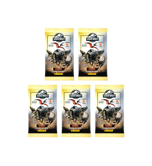 5 Tüten zur "Panini Jurassic World ROAR" Trading Card Kollektion. Jeder Booster enthält 6 Karten.