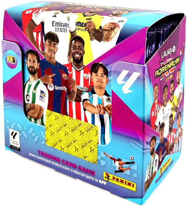 Display mit 50 Tüten zur "Panini LaLiga Adrenalyn XL 2023-24" Trading Card Kollektion. Jeder Booster enthält 6 Karten, somit sind in der Box insgesamt 300 Cards enthalten.