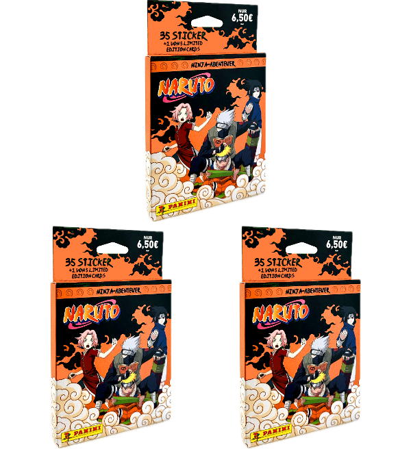 3 x Eco-Blister (=21 Tüten + 3 Limited Edition Cards) aus der "Panini Naruto Ninja Adventures" Sticker-Kollektion. Jede Tüte enthält 5 Sammelbilder.