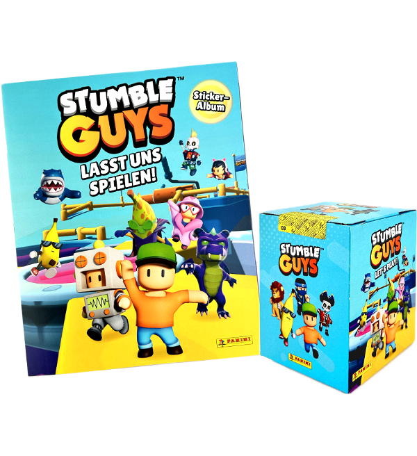 Album + Display mit 36 Tüten aus der "Panini Stumble Guys Let's Play" Sticker-Kollektion. Jede Tüte enthält 5 Sammelbilder.
