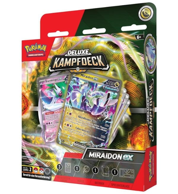 Das Pokemon Deluxe Kampfdeck "Miraidon EX" mit folgendem Inhalt: