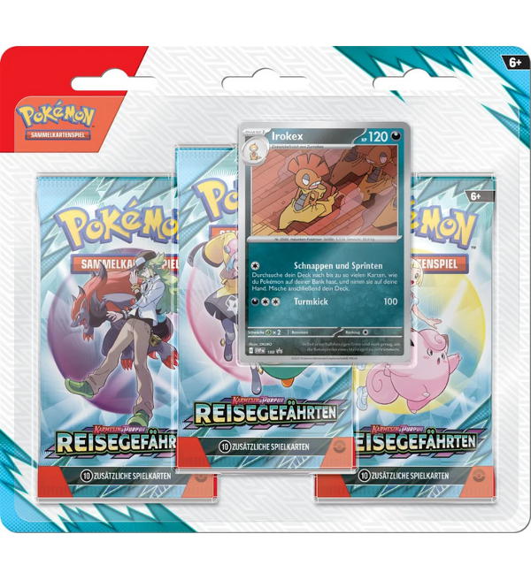 Ein 3-Pack-Blister (Version Irokex) des Pokémon Erweiterungs-Sets "Karmesin & Purpur Reisegefährten" mit folgendem Inhalt: