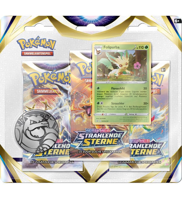 Ein 3-Pack-Blister (Version Folipurba) des Erweiterungs-Sets "Strahlende Sterne" aus der Schwert & Schild Serie mit folgendem Inhalt: