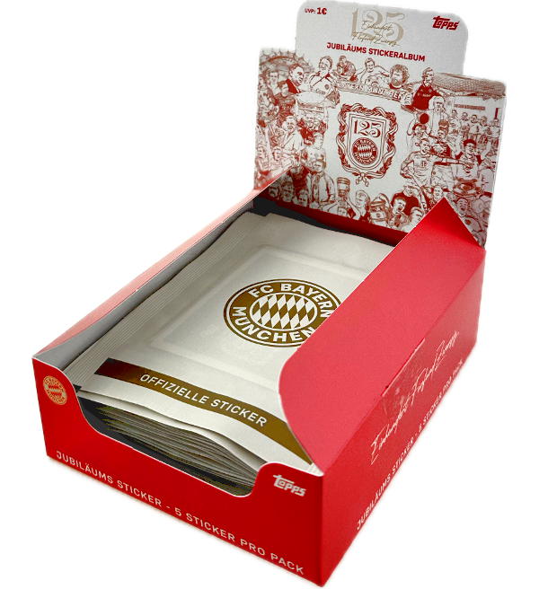 Album + 1 Display (=30 Tüten) der "Topps 125 Jahre FC Bayern München" Sticker-Kollektion. Jede Tüte enthält 5 Sammelbilder.