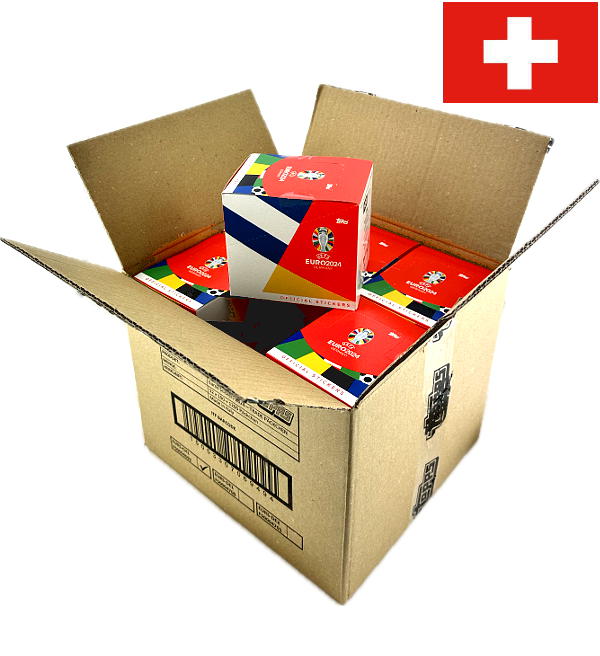 1 Case mit 12 Displays (SWISS EDITION) zur "Topps EURO 2024" Sticker-Kollektion. Jede Tüte enthält 6 Sticker.