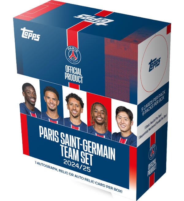 Eine Sealed Box des Topps Paris Saint-Germain Team Set 2024/25 mit folgendem Inhalt: