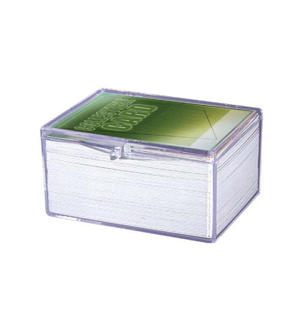 Durchsichtiger Sammelkartenhalter mit Schnappverschluss. Die Box kann 100 Karten in Standardgröße und -stärke aufnehmen (Karten nicht im Lieferumfang enthalten).